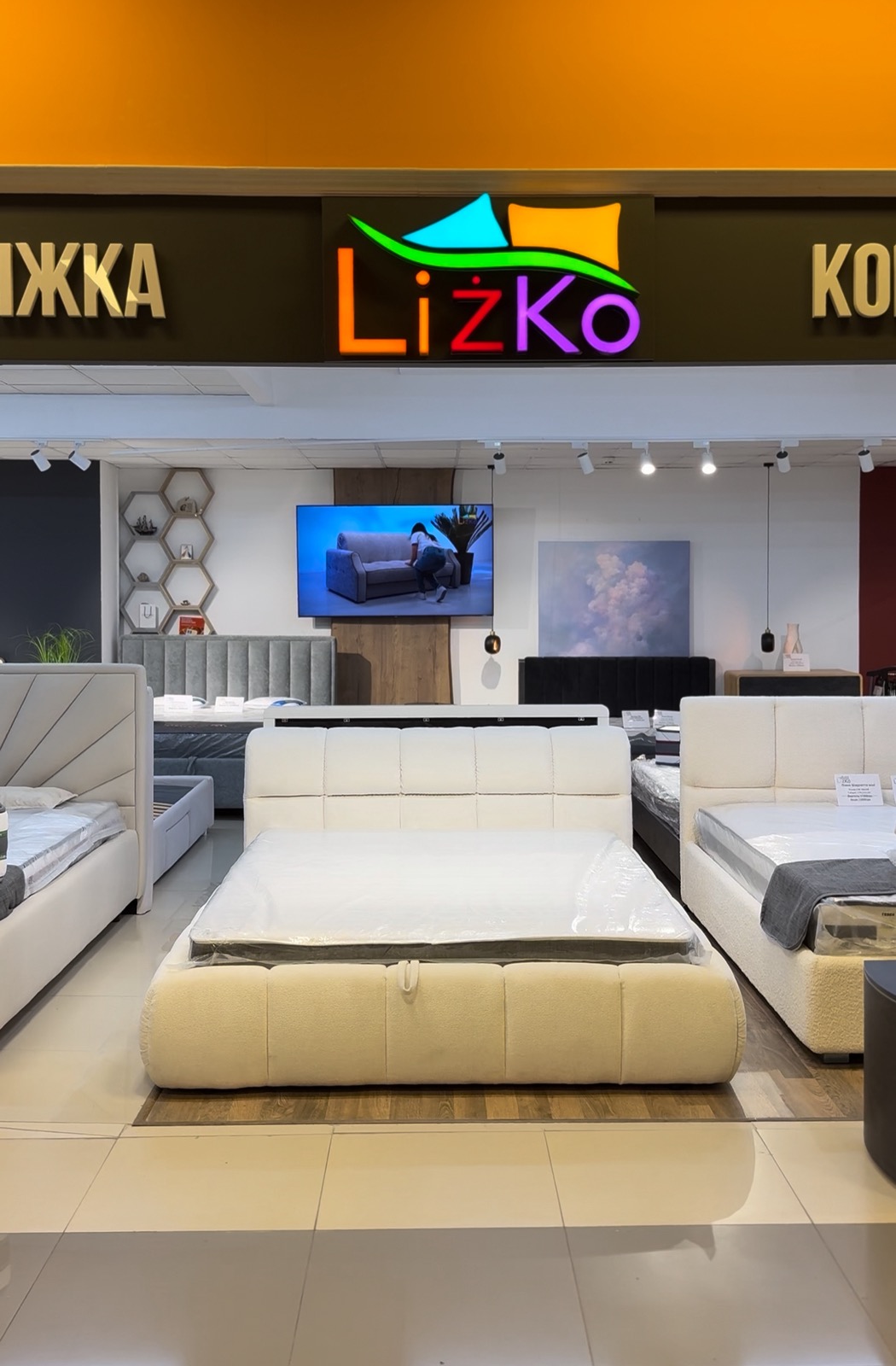 Наші послуги: beds; living room furniture: wall units, TV stands, tables; custom furniture design; selection of materials, hardware, and components; pillows, mattress toppers